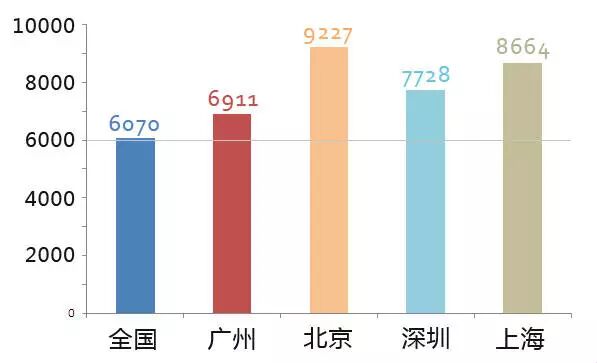 2015年度,全国32个主要城市的平均月薪是6070元,其中北京位列第一,平均月薪达到了9227元,而上海和深圳紧随其后,分别是8664元和7728元,广州,达到了6911元。