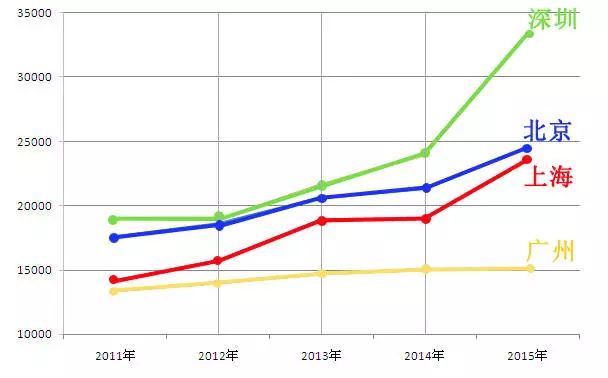 2011年-2015年近5年,北上广深房价涨幅差异化明显: