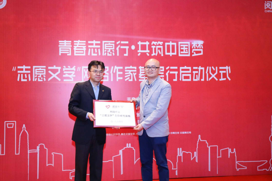 图:团中央青年志愿行动指导中心主任张朝晖向阅文集团高级副总裁、总编辑林庭锋授牌