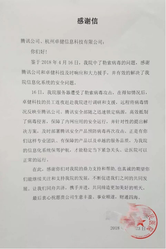 2018年4月16日,国内某医院的服务器遭受勒索病毒攻击,腾讯企业安全了解情况后联合杭州卓健信息科技有限公司对该医院连夜进行调研和支持,成功抵御了病毒侵害,同时部署产品腾讯“御点”,预防病毒再次攻击。近日,医院致信向腾讯企业安全和卓健科技表示感谢。