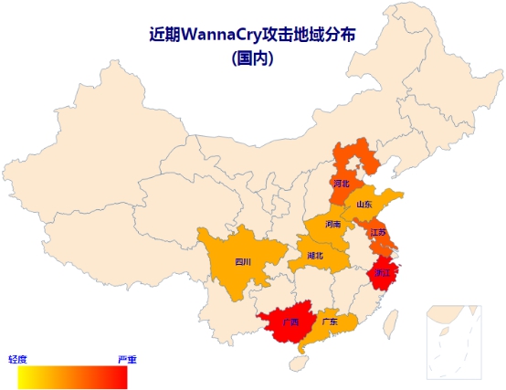 (图:近期勒索病毒WannaCry变种攻击在国内分布)