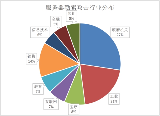 在遭到服务器勒索攻击的行业分布方面,政府机关占比最高,工业、医疗行业等传统行业是重灾区,三者所占比例高达56%。腾讯企业安全技术专家指出,主要原因或由于传统行业往往在信息安全上的投入较少,服务器没有及时修复高危漏洞,没有良好的安全规范等问题普遍存在。