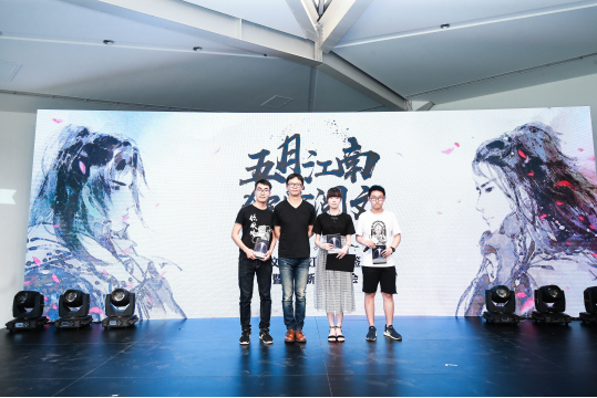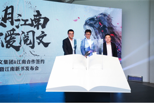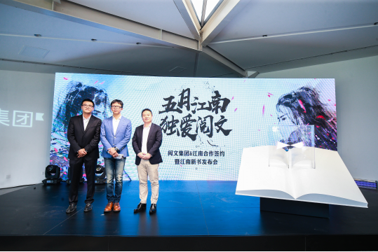 (左起:阅文集团高级副总裁张蓉、作家江南、阅文集团联席CEO梁晓东)