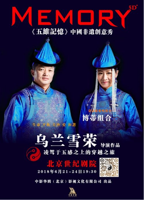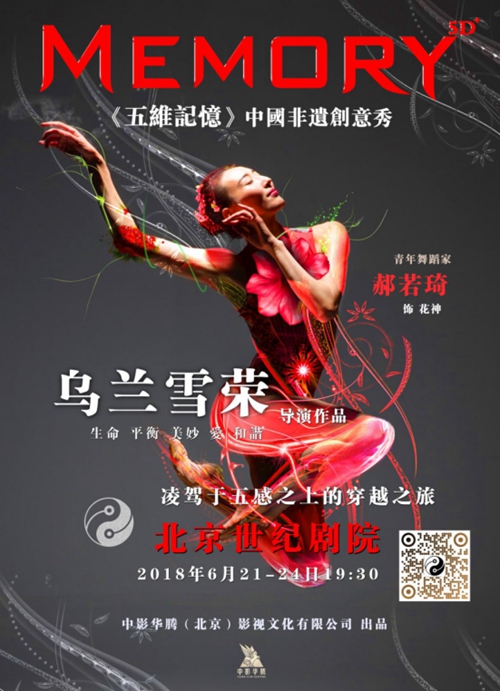 记者获悉,中国非遗创意秀Memory 5D+《五维记忆》由当代美声艺术家、中影华腾总制作人、总导演乌兰雪荣携手中、美顶级制作团队、用近六年时间心血倾力打造,将世界最先进最顶级的视觉、嗅觉、听觉等舞台技术与演出情景完美结合,以好莱坞式电影叙事结构,将歌唱、舞蹈、器乐、杂技、互动等27种罕见的中国非遗艺术表演形式巧妙融合到一个精彩动人、荡气回肠的爱情故事之中,延伸观众席,覆盖全剧场,使传统舞台迅速变身为一个巨大的能量场,让每位观众沉浸在亦梦亦幻的空间中,360度全方位感受到立体有声、有色、有味的逼真效果,感受“爱、和谐、美好、奇妙、壮观”。