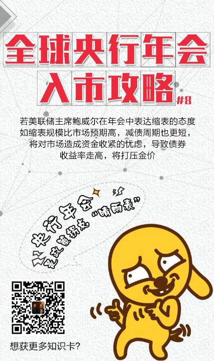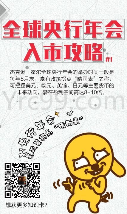 对此数据狗提醒,杰克逊霍尔央行年会中,各央行对未来经济发展和货币政策的态度值得关注。以往每次都会有重要央行官员释放明确信号,包括暗示加息或降息、QE等。而美联储主席鲍威尔亦将在年会中就经济和货币政策发表重要讲话。为助投资朋友更好地把握全球央行年会的入市行情,数据狗特别总结了九大“全球央行年会入市攻略(扫码索取整套入市卡片)”: