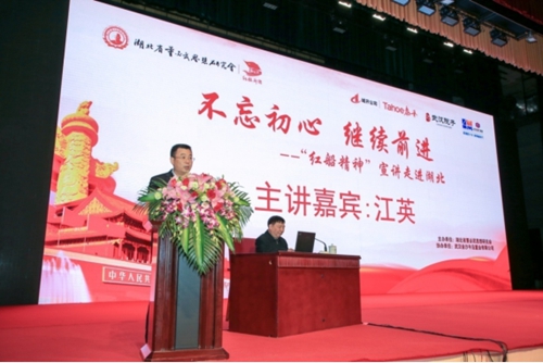 湖北省董必武思想研究会换届后迎来新思路、新气象、新举措。为响应习近平总书记弘扬“红船精神”的指示和深入贯彻党的十九大精神,携手武汉城开房地产开发有限公司、武汉金沙半岛置业有限公司,邀请中国军事科学院战争理论和战略研究部研究员、中共中央党校国际战略中心特邀研究员、中共中央政治局集体学习授课人之一、中央电视台百家讲坛开国大典、建军大业和长征主讲人江英教授作《不忘初心、继续前进》“红船精神”主题宣讲。