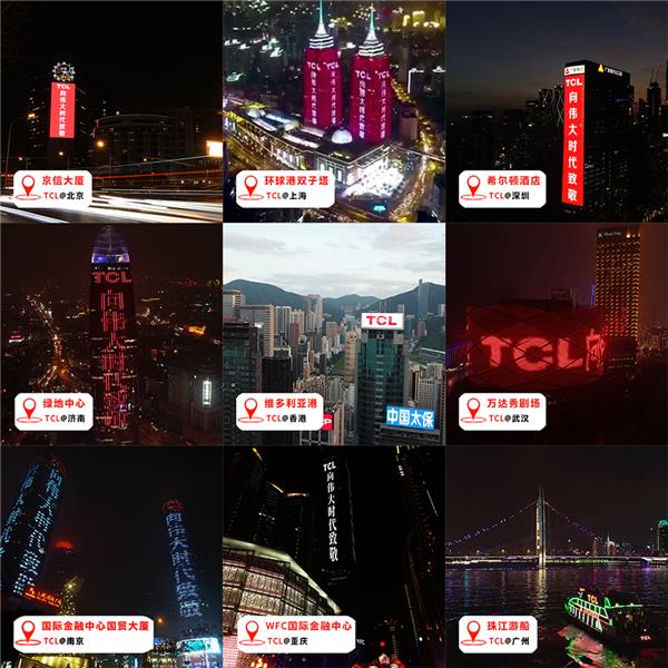 (图为“TCL 向伟大时代致敬”点亮9大城市地标)