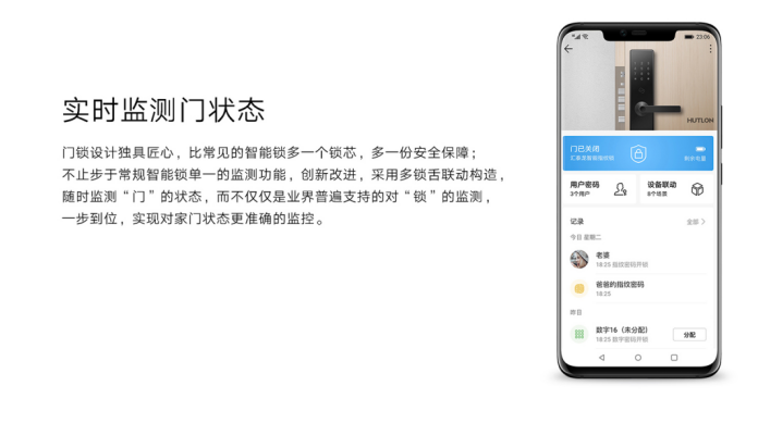 设计是智能的。华为智选生态产品 汇泰龙智能指纹锁采用多锁舌联动结构,并拥有实时监测功能,与华为智能家居APP互联互通。实时监测门开关状态、是否关好;不法分子撬门,防撬告警;开锁记录及时查;胁迫指纹开锁,告警信息悄悄推……