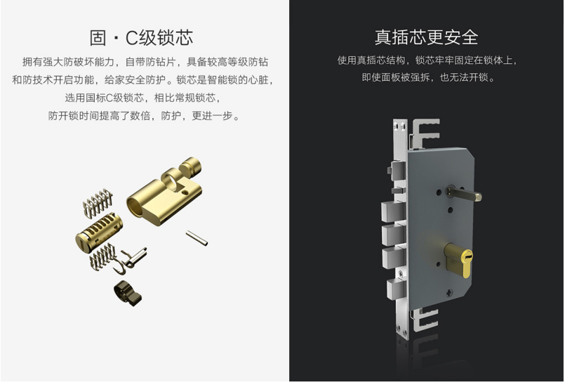 设计是严谨的,全方位安全守护。华为智选生态产品 汇泰龙智能指纹锁配备市面上最高等级的C级锁芯,并采用“真插芯”结构和防猫眼开锁设计,具备更高等级的防钻和防技术开启能力;使用“RSA非对称加密算法”,保障数据安全;具备严格的电机控制电路,有效防止“小黑盒”等强烈的电磁干扰开锁。