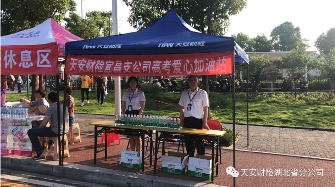 今年高考,宜昌中支和下辖四级机构联合行动,将机构装有饮用水的爱心助考车和“爱心加油站”分散设置在五所考场门口,尽可能地扩大服务范围,以帮助到更多的考生能够顺利完成他们人生的第一次大考。