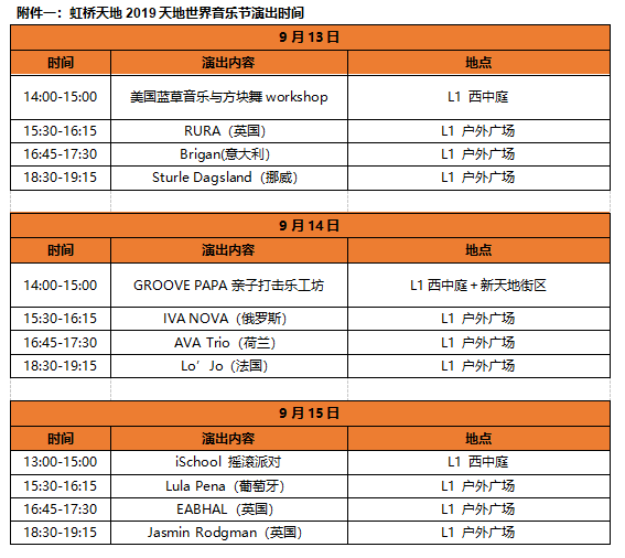 除重磅国际级表演外,此次虹桥天地世界音乐节还专设亲子板块,并邀请表演音乐家参与其中。9月13日及14日期间,开设“美国蓝草音乐与方块舞亲子工作坊”、“GROOVE PAPA打击乐亲子工坊”,消费者可在音乐家的指导下获得全新音乐体验。9月15日,虹桥天地还将携手iSchool学校乐队,带来亲子音乐嘉年华,以现场表演搭配公益活动的方式,带来别具一格的音乐感受。