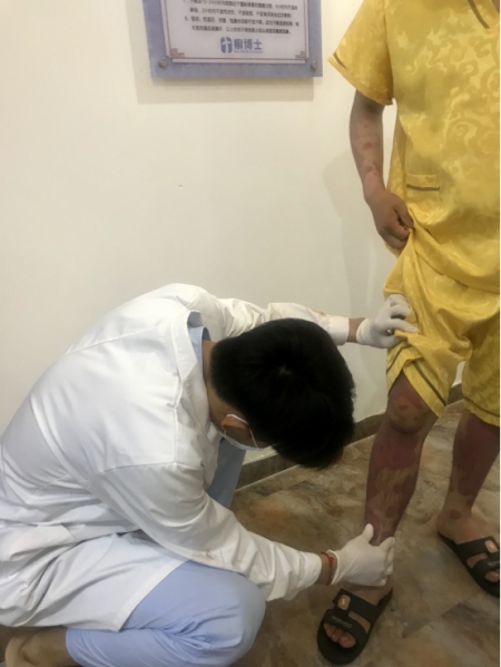 接近采访的尾声,一位大叔走进来跟萧先生告别,记者顺道采访了这位大叔,他说道他今天53岁了,12年来,由最开始的1天1颗阿维A到两年前的1天3颗阿维A,每天忍受着皮肤开裂之痛,所到之处无不是皮屑成堆,来的第一天手都不能伸直,只能屈着,现在伸缩自如,说罢还演示给记者看,“能摸下你的皮肤吗?“大叔笑到当然可以,肉眼看上去,大叔的皮肤无异于常人,摸下去的皮肤更是光滑,看着大叔灿烂的笑容,记者感动之余,也被深深的震撼了,真真是如厦门癣博士负责人萧先生所说,干一件积善行德之事,帮助他人也成就自己。