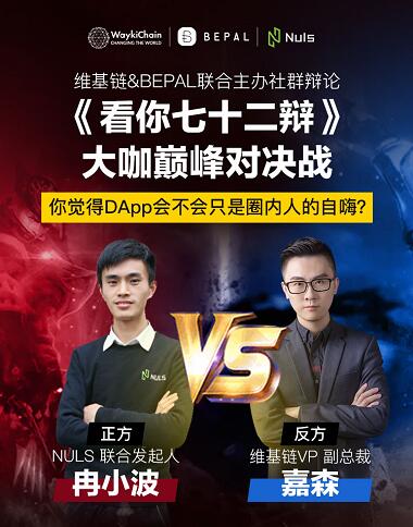 维基链《看你七十二辩》9月25日在社群进行了一场大咖巅峰对决战的辩论直播,辩论主题是“DApp是/不是圈内人的自嗨”邀请到NULS的联合发起人冉小波担任正方辩手,维基链副总裁嘉森担任反方辩手。双方辩手都针对此次辩题分享了精彩的观点。