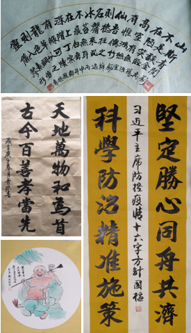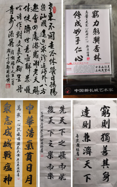 书法是他的另一个爱好。“练习书法,不仅是为陶冶性情,也是对中国传统文化的一种认知。”平素他临摹最多的是颜体,为求真迹,他还专门跑到西安碑林近距离临摹。如今,他的书法也自成一路,有一幅楹联作品镌刻在了汕头市澄海区的塔山风景区。